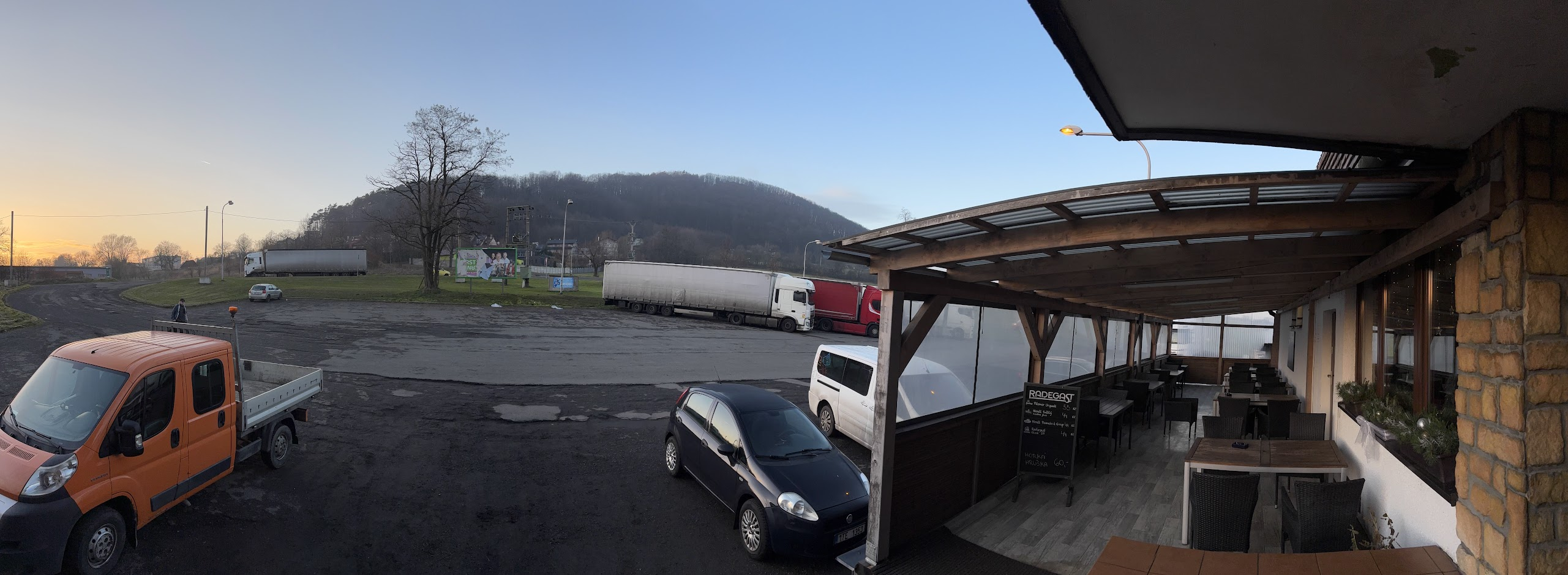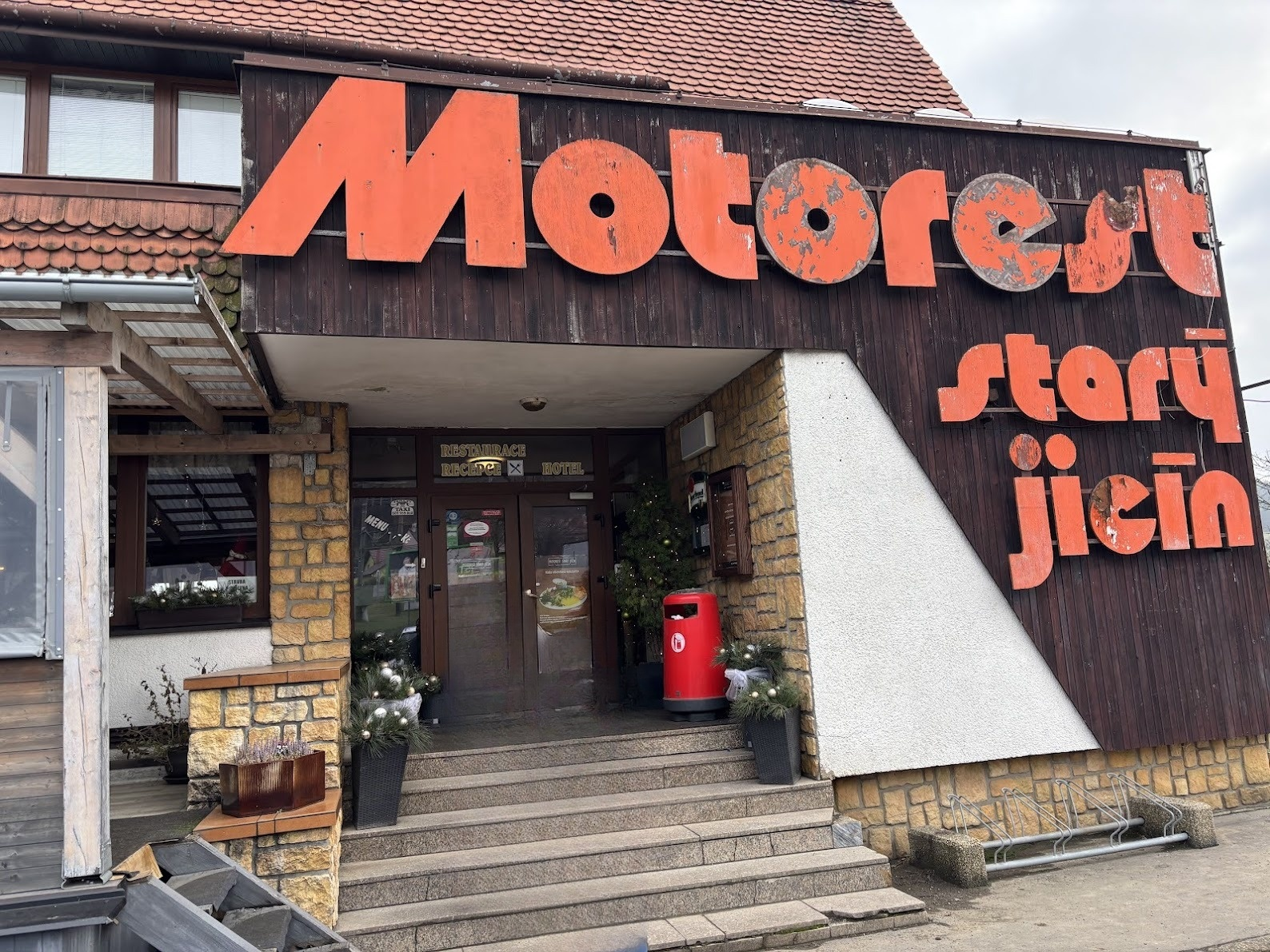 Po nějaké době přicházíme k motorestu. Přebíháme frekventovanou vozovku, abychom se ocitli na parkovišti, které je pokryté kalužemi a výtluky. Zaparkovaným kamionům to nevadí. Motorest působí poněkud zasmušile a nepřátelsky pro pěší. Těžko říct, proč. Motorestní štít už také pamatuje lepší časy a chybí mu minimálně jedno diakritické znaménko. Divím se, že nás nikde nevítá plastiková soška kuchaře, toliko typická pro osmdesátá léta minulého století.