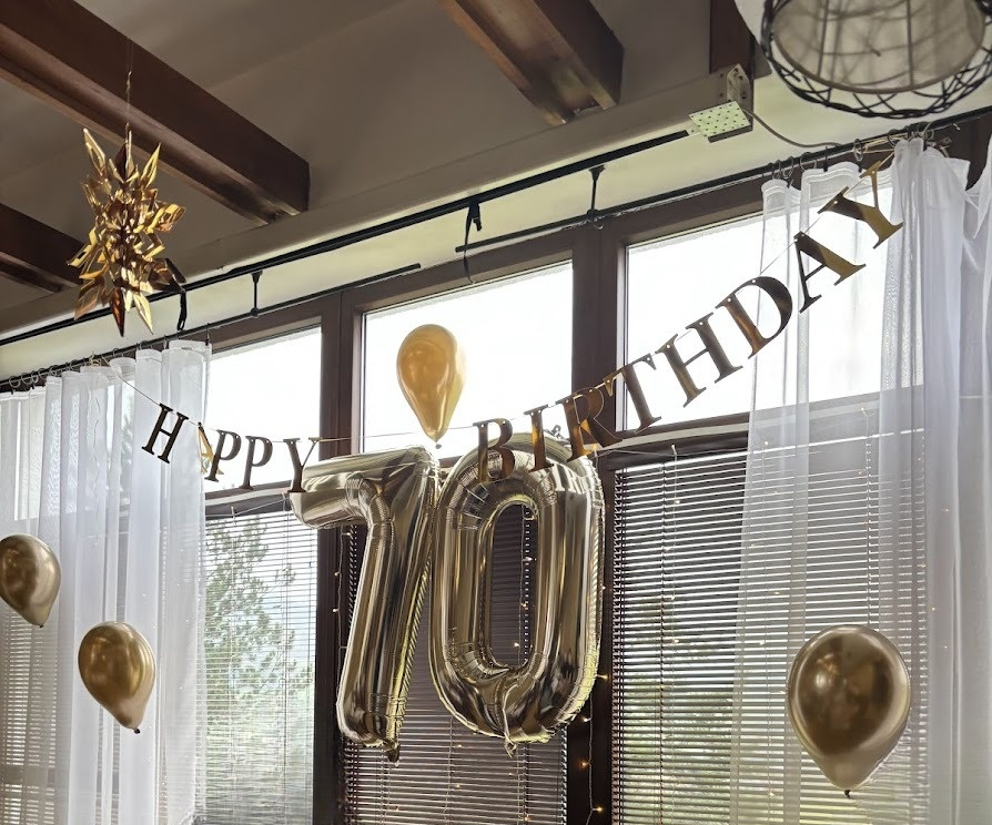 Po delší době přicházejí hlavní chody. Dámy si konečně všímají, že je náš roh vyzdoben narozeninovou tématikou vč. číslovky 70. Okamžitě mě obviňují, že jsem to celé zařídil. Říkám, že já za to určitě nemůžu. Nenechají si nic vymluvit a celou dobu konzumace hořekují, že jsem neměl utrácet za výzdobu. Narozeninové menu na lístku jsem prý zařídil také.