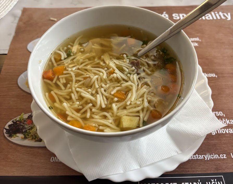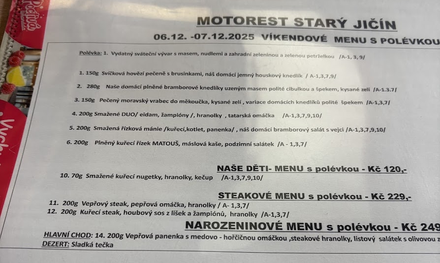 Ostatní členové naší posádky si však ničeho nevšímají. Usadí se a zkoumají jídelní lístek. Tradiční nabídka: hovězí vývar, svíčková (zrovna došla), vrabec, smažený sýr, kuřecí a vepřové řízky, a „narozeninové menu“ v podobě vepřové panenky.