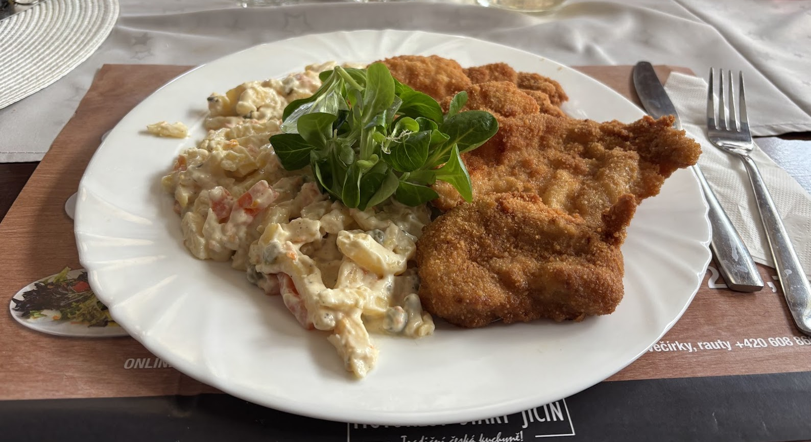 Zkoumám svůj hlavní chod. Tři druhy řízků jsou spíše průměrné a je vidět, že už někde nějakou delší dobu čekaly na kamioňáky a byly po mé objednávce znovu přefritované. Bramborový salát sycený maggi, podravkou či jinou takovou veličinou jsem ještě nejedl, ale kupodivu není vůbec špatný. Určitě si jej dělají na místě, protože brambory jsou uvařené správně.